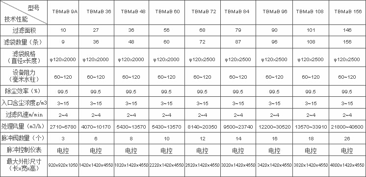 TBMaB 24~156型高、低壓脈沖袋式除塵器技術(shù)性能表